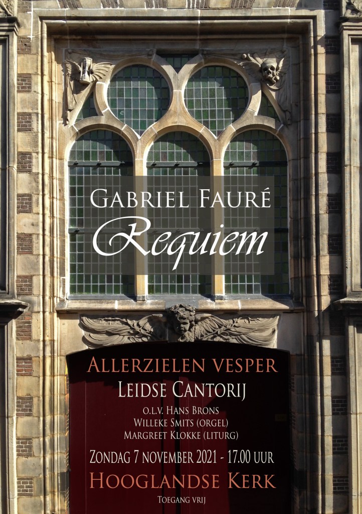 Fauré schreef zijn Requiem in de jaren 1885 en 1887 met gebruikmaking van het Libera Me dat al eerder in 1877 voor bas en koor was gecomponeerd. Anders dan de dodenmissen van bijvoorbeeld Verdi en Berlioz ontbreekt hel en verdoemenis, zo heeft dit stuk geen apart ‘Dies Irae’ als dramatische climax. De algemene stemming is sereen en troostend. ‘Ik zie de dood als een vreugdevolle bevrijding, een verwachting van de gelukzaligheid aan de andere zijde van het graf, niet als een smartelijk afscheid’, aldus de componist. Fauré schiep met name door de keuze van de teksten een zeer persoonlijk werk. dat aanvangt met het woord ‘requiem’ en eindigt met datzelfde woord in de wonderschone engelenzang van In Paradisum, door sommigen wel een wiegelied van de dood genoemd. Deze Allerzielen vesper is een activiteit van Bijzonder Kerkenwerk Leiden en is mogelijk gemaakt door een bijdrage uit het Vitaliteitsfonds van de Protestantse Gemeente Leiden.