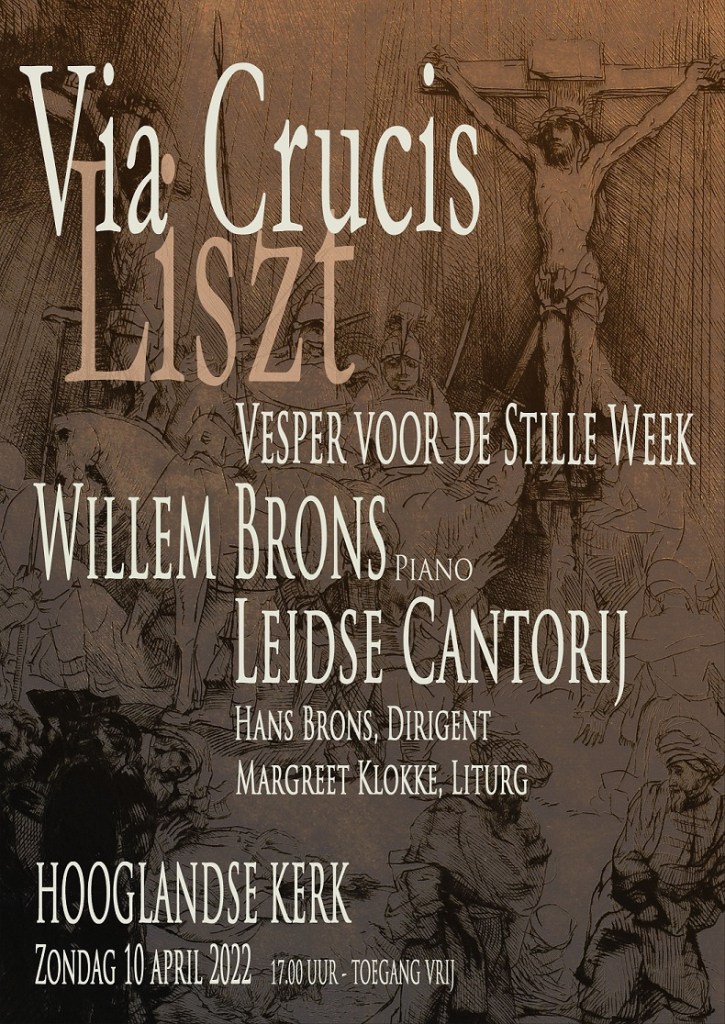 Uitgevoerd wordt de Via Crucis, een indringend werk van Franz Liszt geschreven in 1886 toen deze na een turbulent leven als concertpianist zich terug trok in een klooster en zich ging wijden aan het componeren van kerkmuziek. De 14 kruiswegstaties worden op de piano verklankt door de internationaal vermaarde pianist Willem Brons.